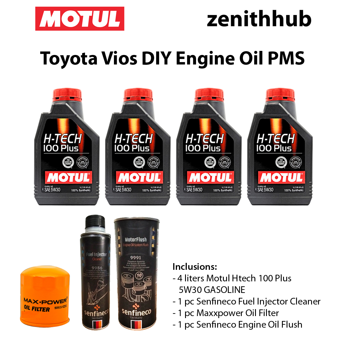 This kit includes 4 liters of Motul H-Tech100 , Maxxpower oil filter, plus Senfineco Engine Oil Flush to help remove deposits before the oil change. It also comes with Senfineco Fuel GASOLINE Injector Cleaner to support better combustion, improved throttle response, and more efficient fuel use.